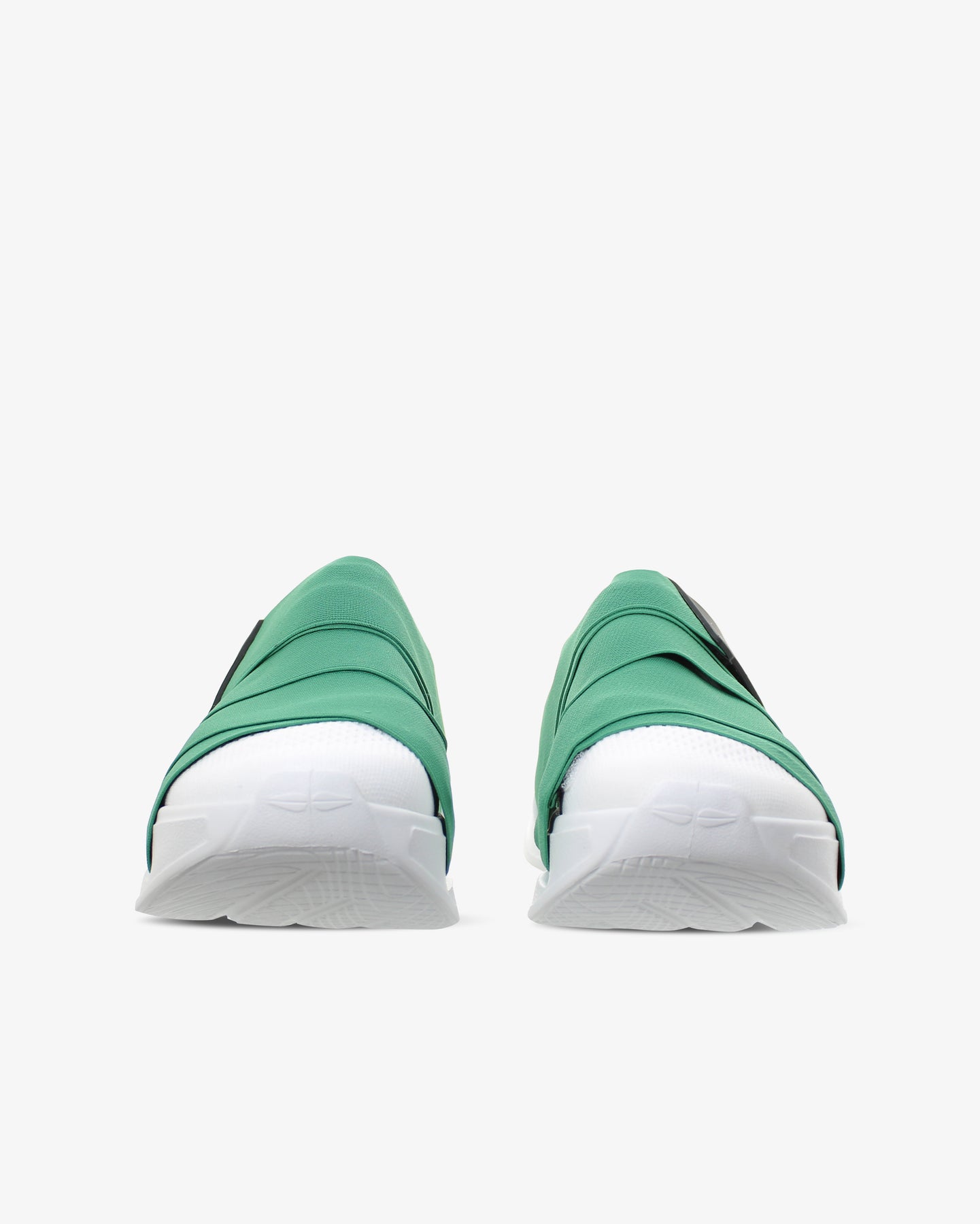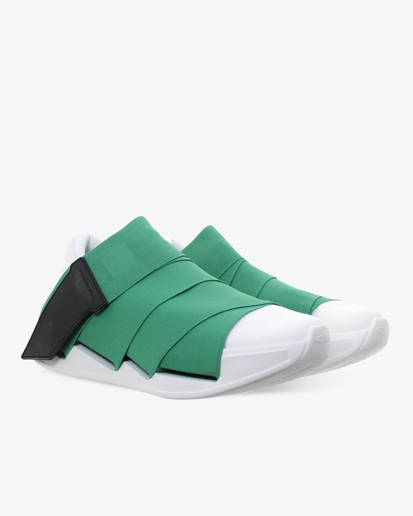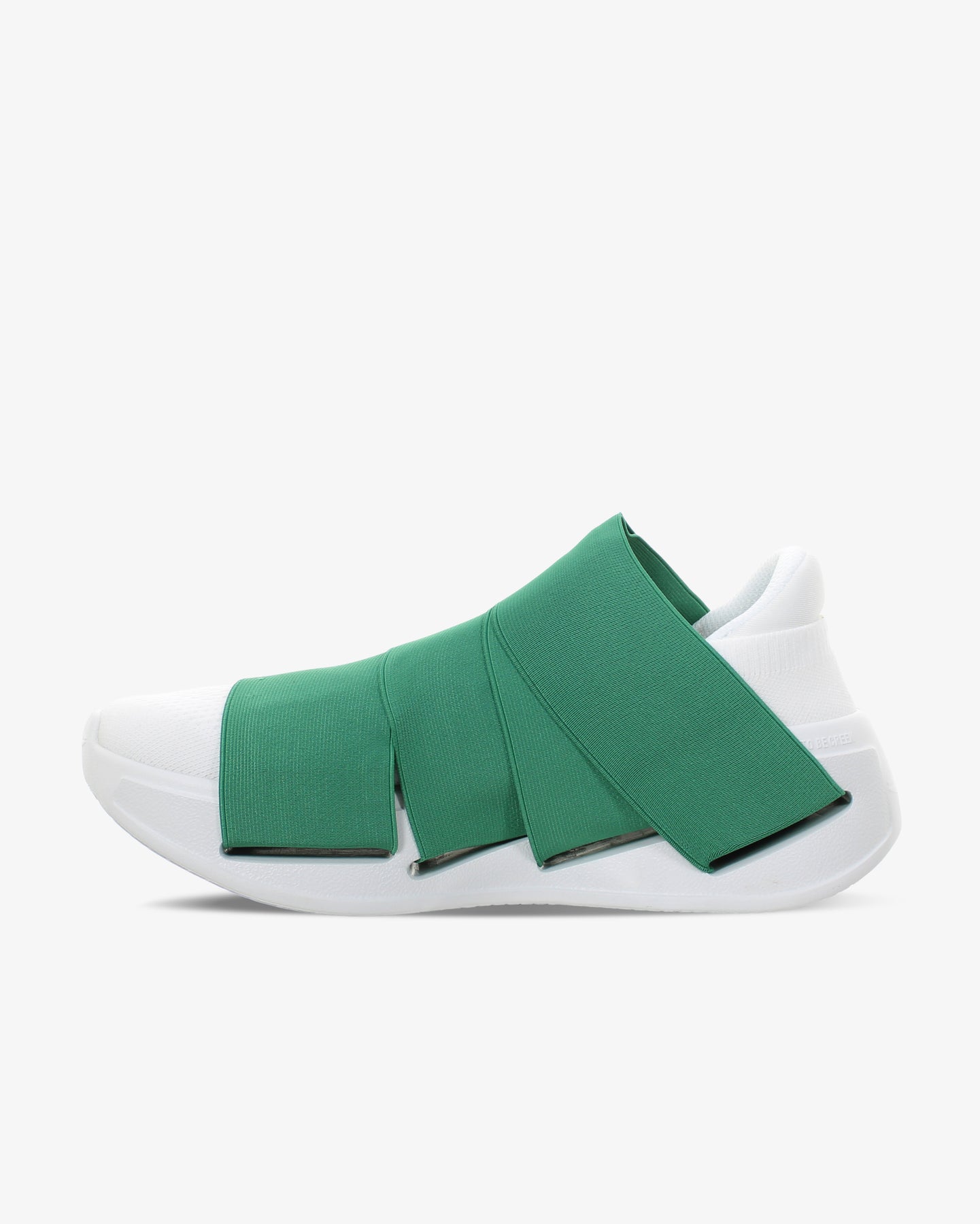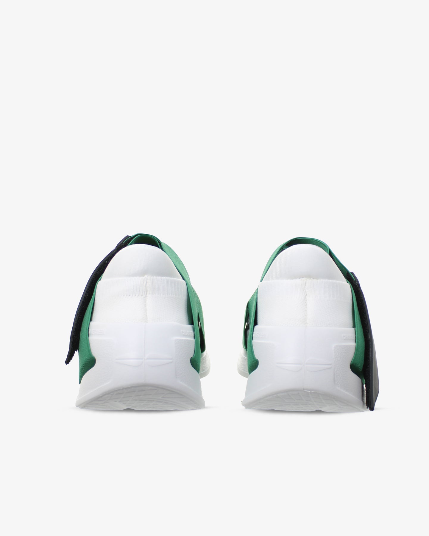 Tomaia elastica di colore verde resistente e avvolgente. Apertura e chiusura con velcro in gomma. La mancanza del procedimento di montaggio industriale riduce l’emissione di Co2 (-50%).