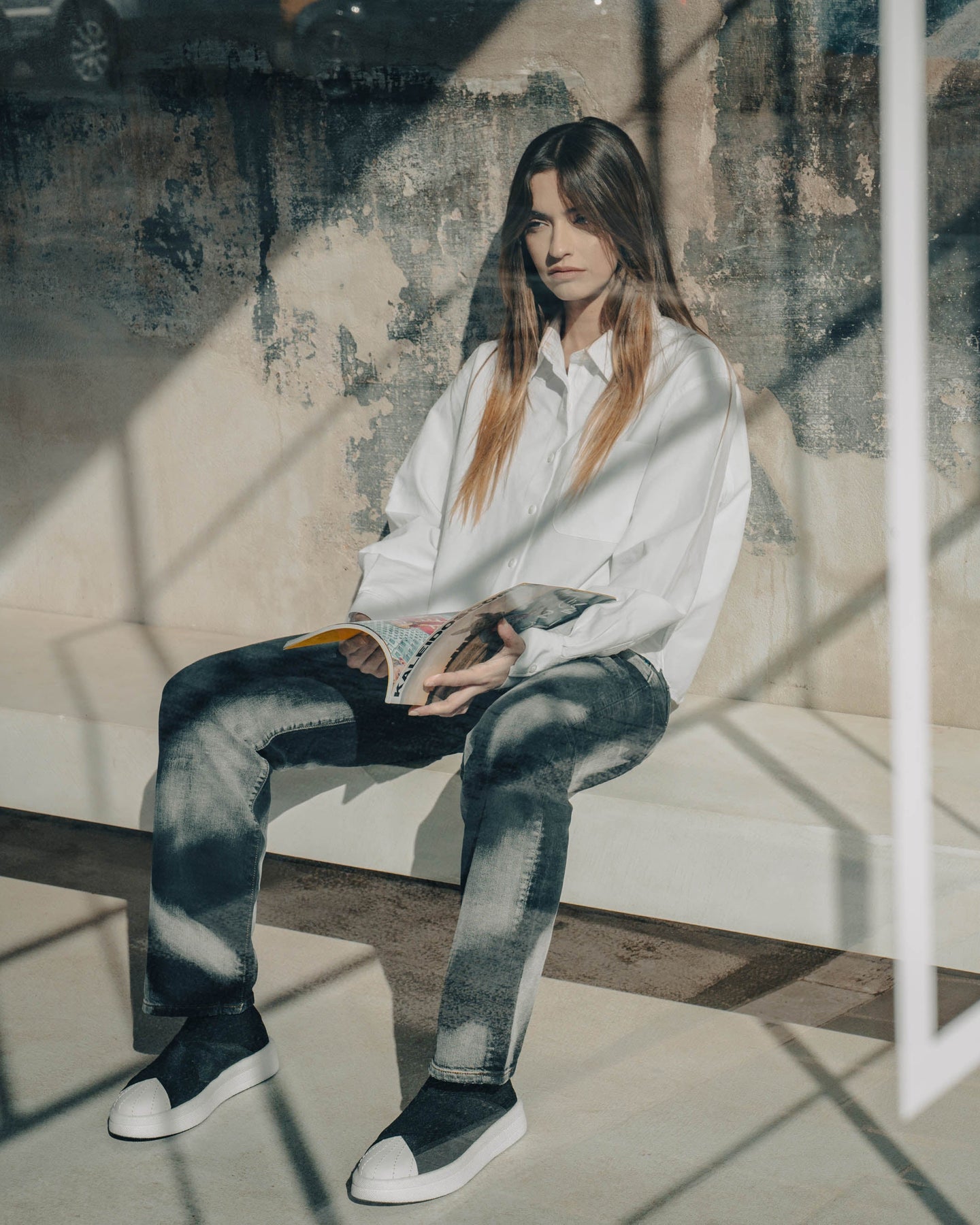 La sock shoe FOAM X, nera con fondo bianco, si presenta con una tomaia realizzata in flyknit, traspirante e leggera, che dona grande freschezza. Le fasce elastiche brevettate sono le icone Fessura. Soletta interna estraibile. Il battistrada in gomma con il logo garantisce un grip ideale su ogni terreno. È una sneaker leggerissima, pesa poco più di 200 grammi.